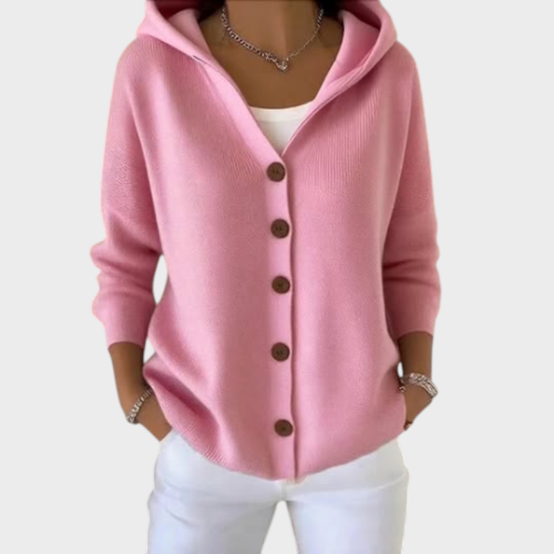 Esta chaqueta de punto con capucha ha sido diseñada para combinar practicidad y encanto en cada detalle. Los botones frontales le dan un toque clásico, mientras que el corte moderno y versátil permite crear looks casuales y cómodos para el día a día.