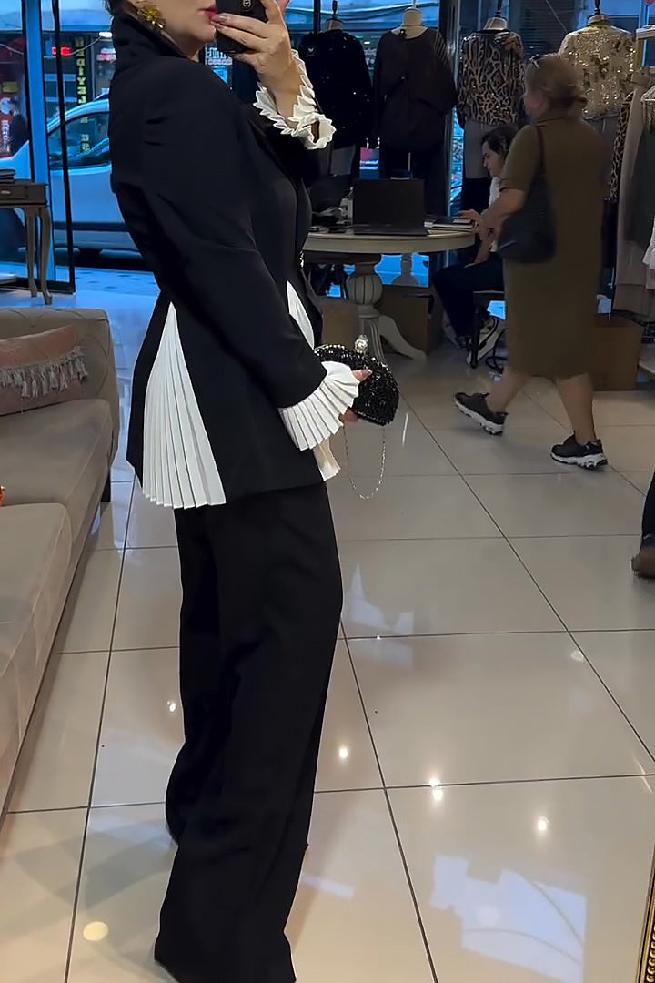Mejora tu armario con esta llamativa chaqueta negra que combina un diseño atemporal con un toque artístico moderno. Diseñada con una silueta entallada de doble botonadura, cuenta con botones dorados ornamentados que le dan un toque de lujo. Los paneles plisados blancos en los laterales y los puños aportan un toque dramático inesperado, creando movimiento y un contraste refinado. El corte entallado favorece la figura y ofrece versatilidad tanto para entornos profesionales elegantes como para conjuntos sofisticados de noche.